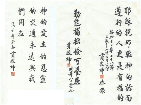 或許在此把父親常說的名言: 工作是道德, 忙碌是幸福, 懶惰是罪惡, 空閒是墮落; 也同時把父親平時恭錄的墨寶,留給後代子孫。希望大家就此聽從父親(爺爺)的教誨,在神的愛,主的恩裡,接受聖靈引領,節哀以圖強。